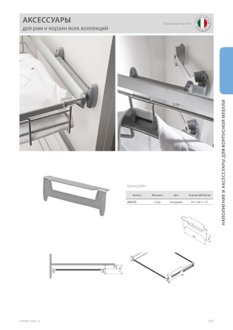 АКСЕССУАРЫ Производитель: Vibo для рам и корзин всех коллекций Кронштейн НАПОЛНЕНИЕ И АКСЕССУАРЫ ДЛЯ КОРПУСНОЙ МЕБЕЛИ Артикул Материал Цвет Размеры (ШхГхВ), мм ASU GS сталь алюминий 60 x 240 x 115 240 64 50 116 ametist-store.ru 229