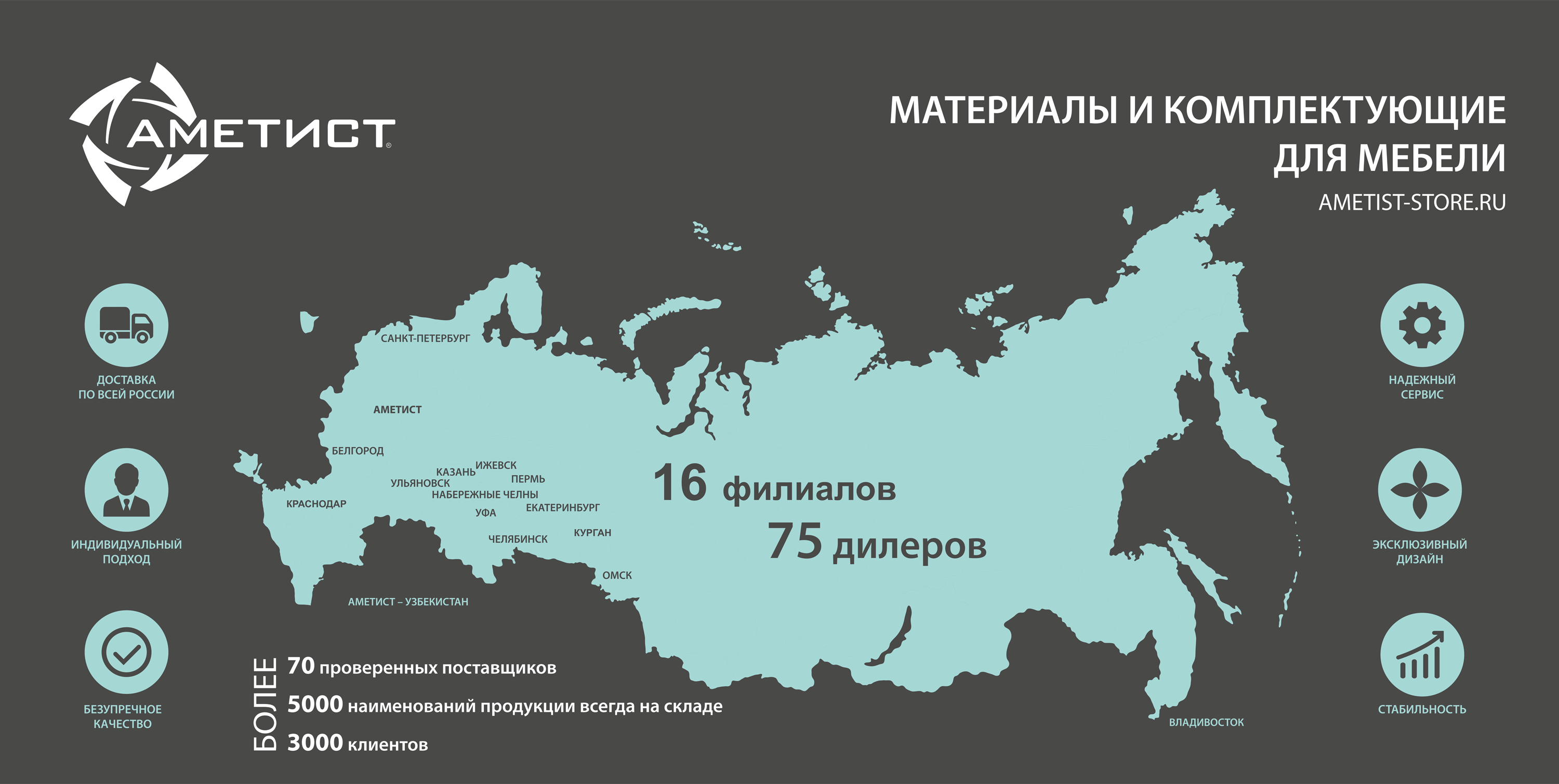 Дилеры компании «Аметист» располагаются по всей России.